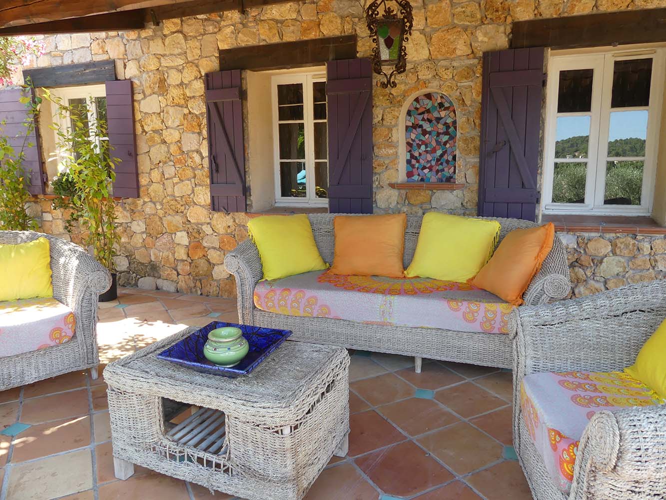 Les terrasses font parties intégrantes de la maison face à la piscine.