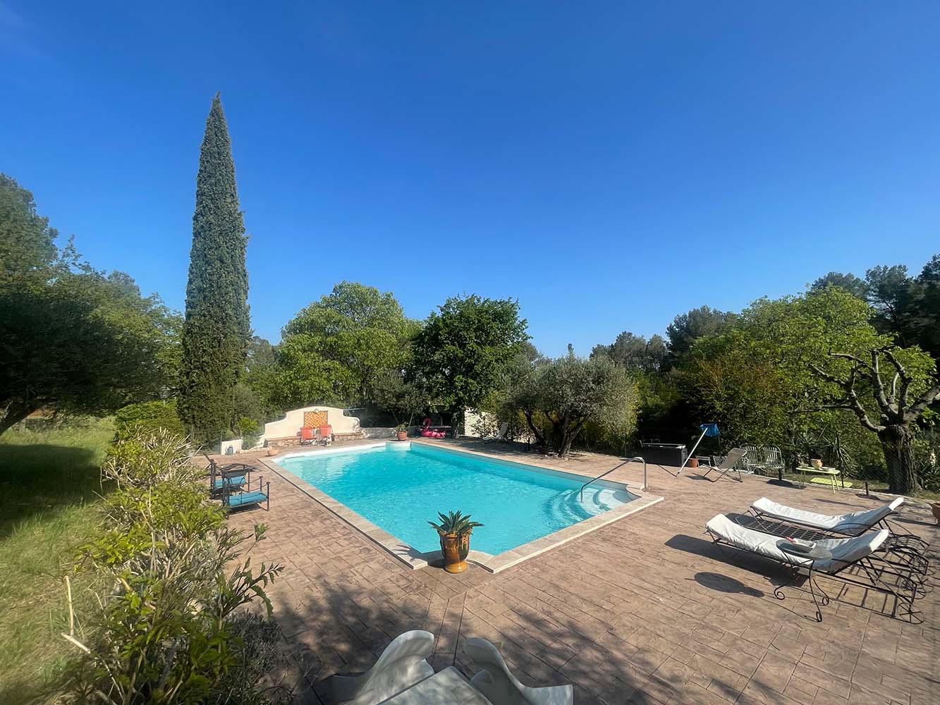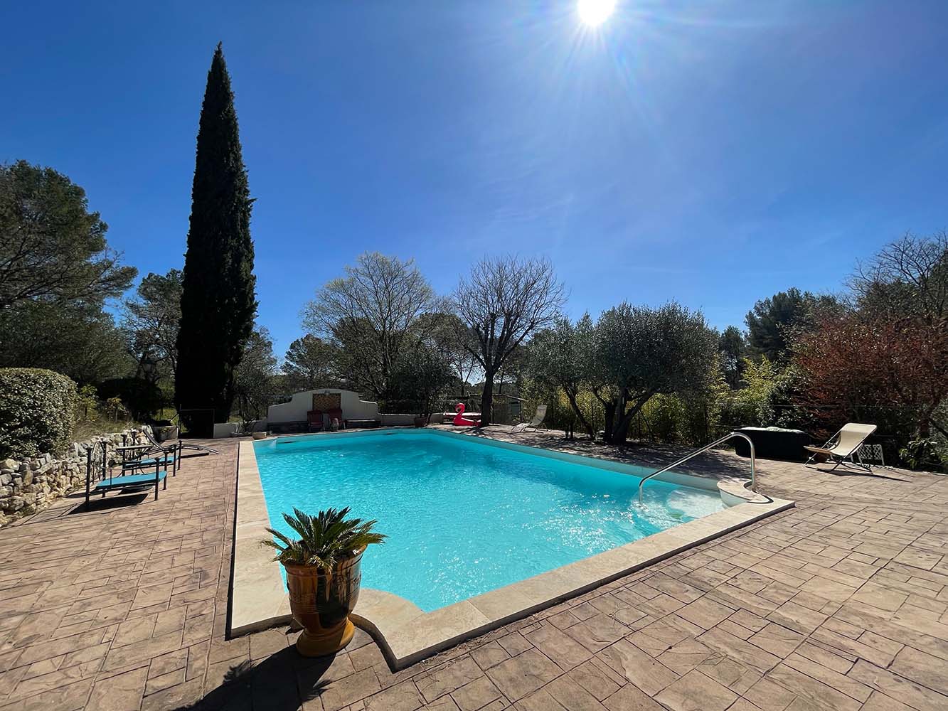 Puis quelques marches vous conduiront à la piscine d’une dimension de 12 m x 6 m sécurisée par une barrière en fer forgé.